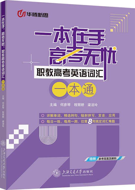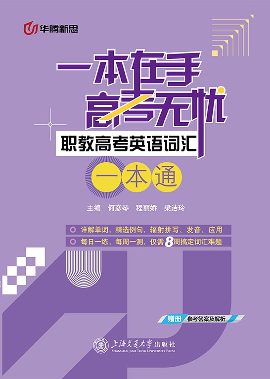 本书根据中等职业教育对英语学科的基本要求,并参照最新的中等职业学校英语课程标准编写而成,是为参加职教高考的考生量身定做的复习用书。本书把考生需要掌握的英语词汇分成了两个部分:高频必背词汇和高分突破词汇。高频必背词汇共包括6周42天的学习内容,每天40个单词,是考生参加职教高考需要掌握的基础词汇;高分突破词汇共包括2周14天的学习内容,每天30个单词,是考生突破现有水平、获得更高分数需要掌握的高级词汇。在编排上,本书除了对主词条的词汇进行举例讲解外,也精心选取了重点词汇的常见固定搭配;本书的即学即练部分按照不同的题型为考生准备了有关当天所学词汇的练习题,旨在通过练习不同类型的题目,帮助考生加深对当天所学词汇的理解和记忆,并在练习的过程中掌握该词汇的用法;每周的最后一天是针对本周所学词汇的综合检测,通过不同的题型反复练习本周所学词汇,使考生反复复习、记忆所学词汇,减少遗忘,更加高效地备考。
