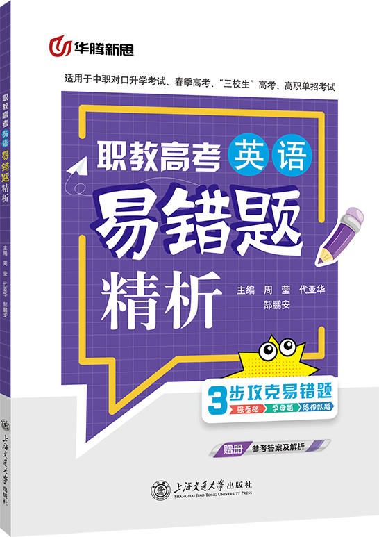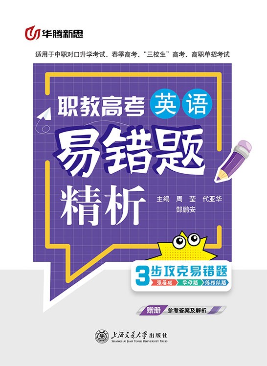 本书依据近几年各地职教高考英语科目的考试情况进行编写,内容包括名词、冠词、数词、代词、介词等16个专题,每个专题根据考生的实际情况设置了一个或多个易错点,每个易错点用精练的语言讲解了考生容易混淆的知识(强基础),并配有例题(学母题)以及足量的练习题(练相似题)。本书从讲到练,科学实用,使考生能够系统、扎实地掌握重点知识,强化学习效果。