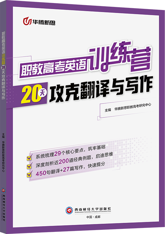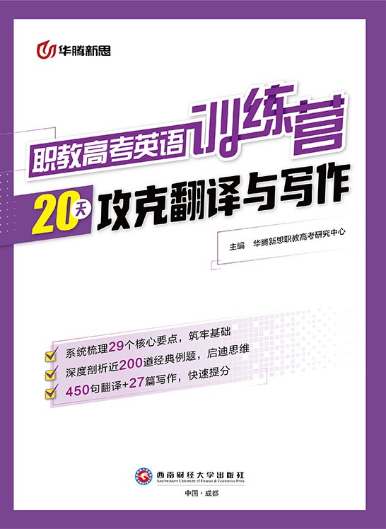 《职教高考英语训练营:轻松攻克翻译与写作》依据职教高考的考试真题和最新考试大纲编写而成,是为参加职教高考的考生量身定做的复习用书。全书分为20天学习计划。前8天为翻译部分,针对职教高考真题中的翻译给出翻译技巧及相应的训练;后12天为写作部分,是对应用文写作、记叙文写作和议论文写作的的专项解读及训练。本书题型、试题难度等设计均参照了职教高考的真题和最新考试大纲,从职教高考的特色出发,做到既能把握考试的命题特点,又能体现其发展趋势。本书包含大量的实战练习题和模拟试题,涵盖了各种类型的翻译和写作题目,能够帮助学生熟悉考试题型,提高解题能力。同时,每个题目都配有详细的解析,帮助学生理解题目要求,掌握解题技巧。