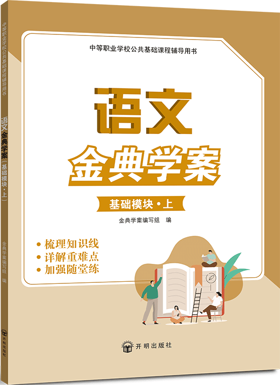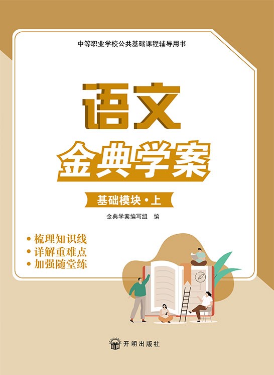 本书根据中等职业教育对语文学科的基本要求,并参照最新的中等职业学校语文课程标准编写而成。全书共分为8个单元,根据中等职业学校学生的学习特点设置了相应的学习阶段,分别是“课前——预习·梳理”“课中——思考·探究”“课后——巩固·提升”具体来说,“课前——预习·梳理”部分包括“知识梳理”和“预习检测”,对基础知识进行了深入挖掘与详细梳理,细致全面,井然有序,旨在以这些基础知识为切入点,帮助学生建立牢固的知识体系。“课中——思考·探究”部分设置了具体的学习任务,以任务为导向,引导学生自主思考,解决问题,加强师生之间的互动,让学生动脑,让课堂气氛更活跃,让语文课不再枯燥。“课后——巩固·提升”部分设置了“基础知识”“阅读提升”“综合实践”“写作训练”四类试题,基础知识检测与阅读能力训练相结合,帮助学生有效巩固所学知识。另外,每个单元还设有单元测试卷,全书设有期末测试卷,使学生能够及时进行自我检测,及时查漏补缺,提升语言文字运用能力。