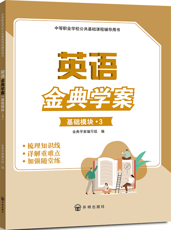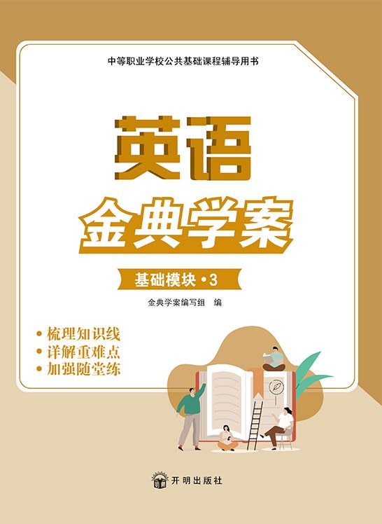 《英语金典学案(基础模块·3)》的主体内容按照“课前预习—课中详解—课后巩固”的思路进行编写,包含单元(章节)测试卷、期中测试卷或期末测试卷等综合测试卷。“课前预习”对课堂上将要讲解的知识进行重难点提示或提供背景介绍,帮助学生提前进入学习状态;“课中详解”辅助教师对课本知识进行精讲、探究,帮助学生掌握学习的重难点,领会核心知识,提升核心素养;“课后巩固”针对课堂所讲解的知识点,辅以相应的练习题,帮助学生进行巩固提升,做到学以致用;“综合测试卷”参考考试常见题型命制独立试卷,重视对知识点的综合考查,阶段性地检测学生的学习成果。