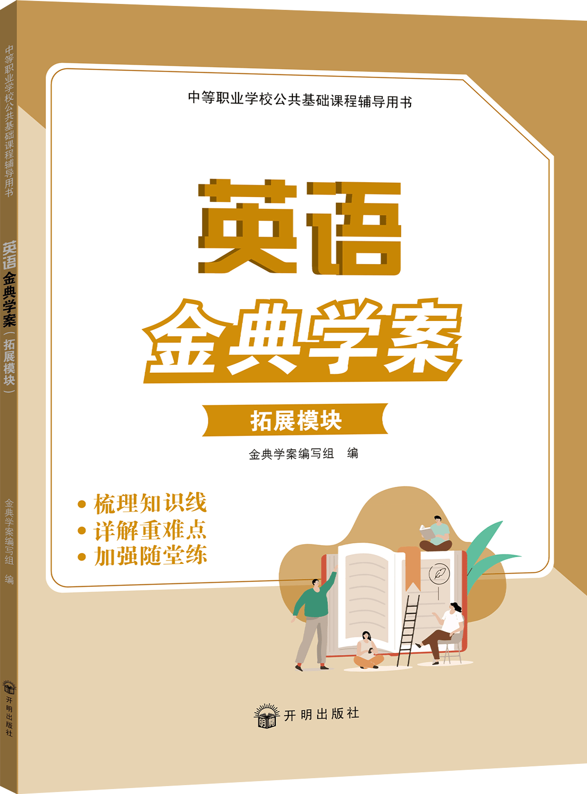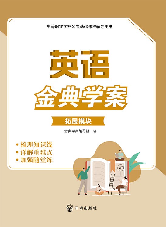 本书根据中等职业教育对英语学科的基本要求,并参照最新的中等职业学校英语课程标准编写而成。全书共分为8个单元,每个单元均按照《英语》(拓展模块)的版块内容划分为四个部分: Listening and Speaking、Reading、Writing & Culture Understanding和Language Practice。每个部分均设有学习目标、课前——预习?梳理、课中——精讲?探究和课后——巩固?提升。学习目标使学生在一开始就明确需要掌握的内容;课前——预习?梳理使学生对本部分的重点知识一目了然;课中——精讲?探究对本部分的重难点知识进行了详细讲解,并配以典例剖析,使学生能够更加深入地理解所学知识;课后——巩固?提升能够让学生及时巩固所学知识。另外,每个单元还设有综合测试卷,使学生能够及时进行自我检测,查漏补缺,提升英语运用能力。